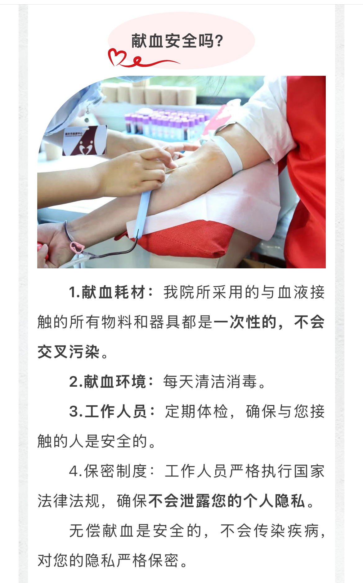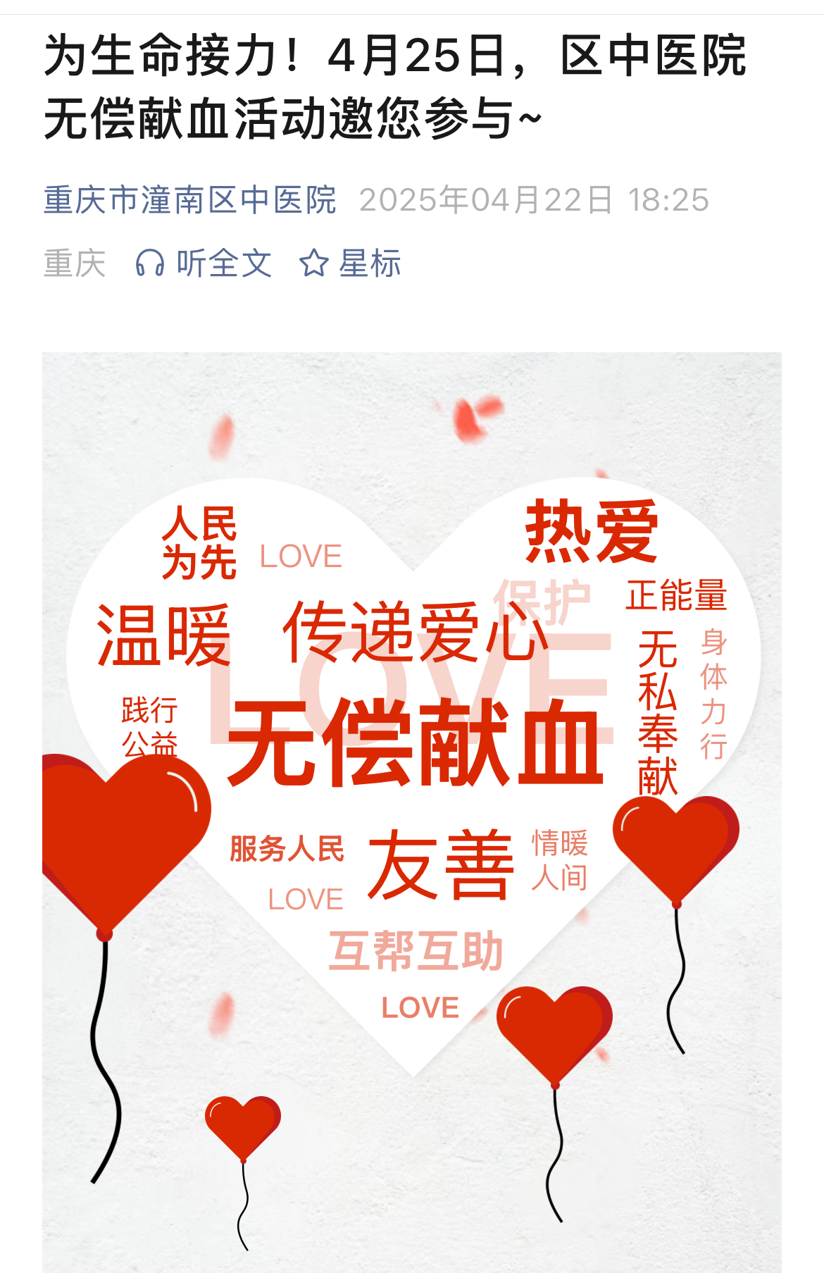 同时,该院不仅号召医务人员以身作则、率先垂范,以实际行动践行“医者仁心”的使命担当,还充分利用新媒体传播优势,在“重庆市潼南区中医院”微信公众号上以图文并茂的形式,详细介绍了献血条件、献血前后注意事项、献血的安全性等内容,广泛动员全区市民加入到献血队伍中来,为缓解血液紧缺状况贡献力量。