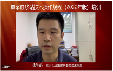 2022年9月8日,根据市卫生健康委安排,在医政医管处具体指导下,由重庆市采供血质量安全控制中心(市血液中心)组织的重庆市《单采血浆站技术操作规程(2022年版)》培训班以线上培训方式顺利举办。市卫生健康委医政医管处主任科员徐陈鸽在开班式上致辞,市血液中心副主任、质量负责人谢成兵主持本次培训。来自我市采供血及医疗机构的近300人参加了此次线上培训。